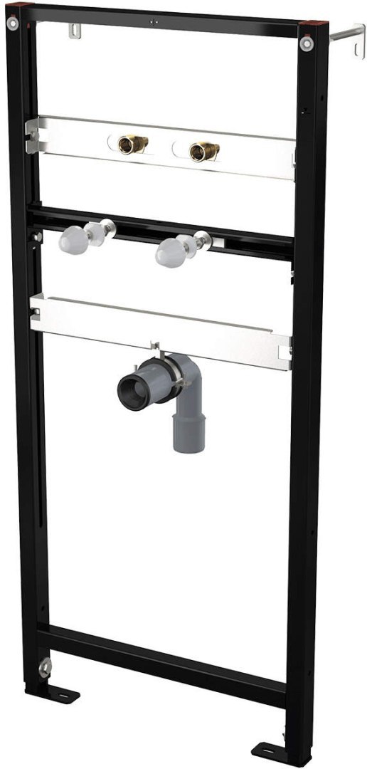 Stelaż montażowy do umywalki wiszącej z ramą samonośną, regulowanymi nogami i możliwością instalacji baterii stojącej