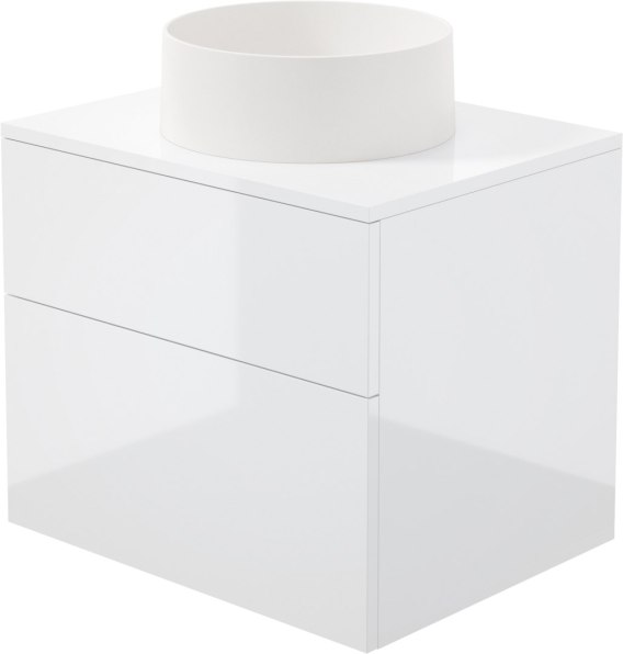 Szafka zachwyca minimalistycznym designem i funkcjonalnością. Wykończona białym, błyszczącym lakierem nadaje wnętrzu nowoczesnego charakteru. Dwie pojemne szuflady z pełnym wysuwem i cichym domykiem gwarantują komfort użytkowania, a system otwierania push to open podkreśla jej innowacyjny styl. Lakierowany blat z otworem na syfon został idealnie dopasowany do umywalki nablatowej, tworząc spójną całość.