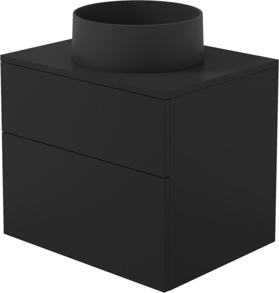 Szafka w matowej czerni harmonijnie współgra z granitową umywalką, podkreślając nowoczesny charakter zestawu. Dwie pojemne szuflady z pełnym wysuwem i cichym domykiem zapewniają komfort codziennego użytkowania, a system push to open akcentuje innowacyjny styl mebla. Blat z otworem na syfon został perfekcyjnie dopasowany do umywalki, tworząc jednolitą i elegancką całość.